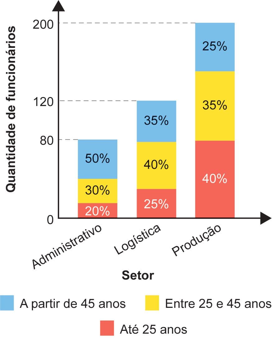 Uma empresa tem 400 funcionários, distribuídos em três setores: administrativo, logística e produção. O gráfico apresenta a distribuição quantitativa desses funcionários, por setor e por faixa etária.